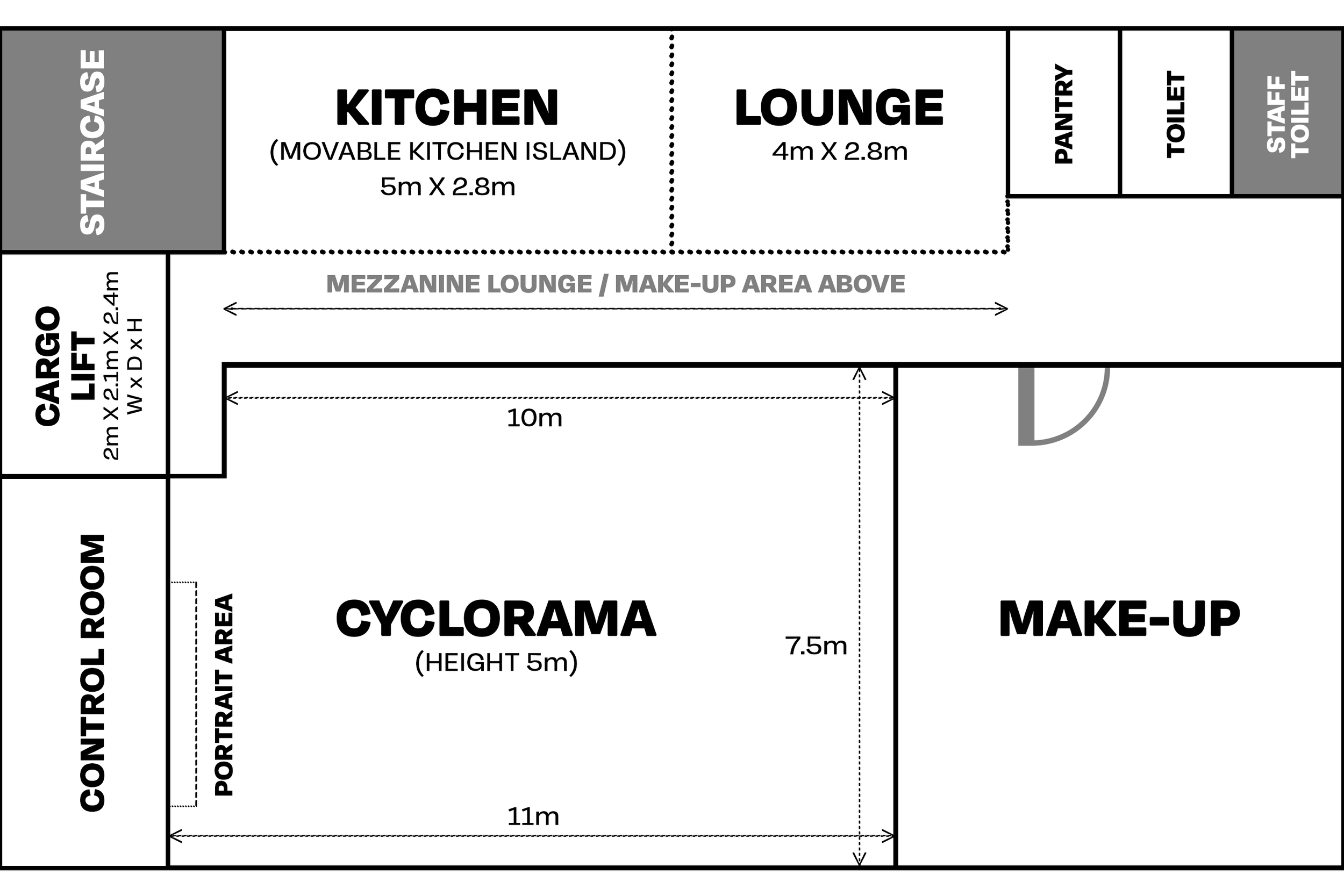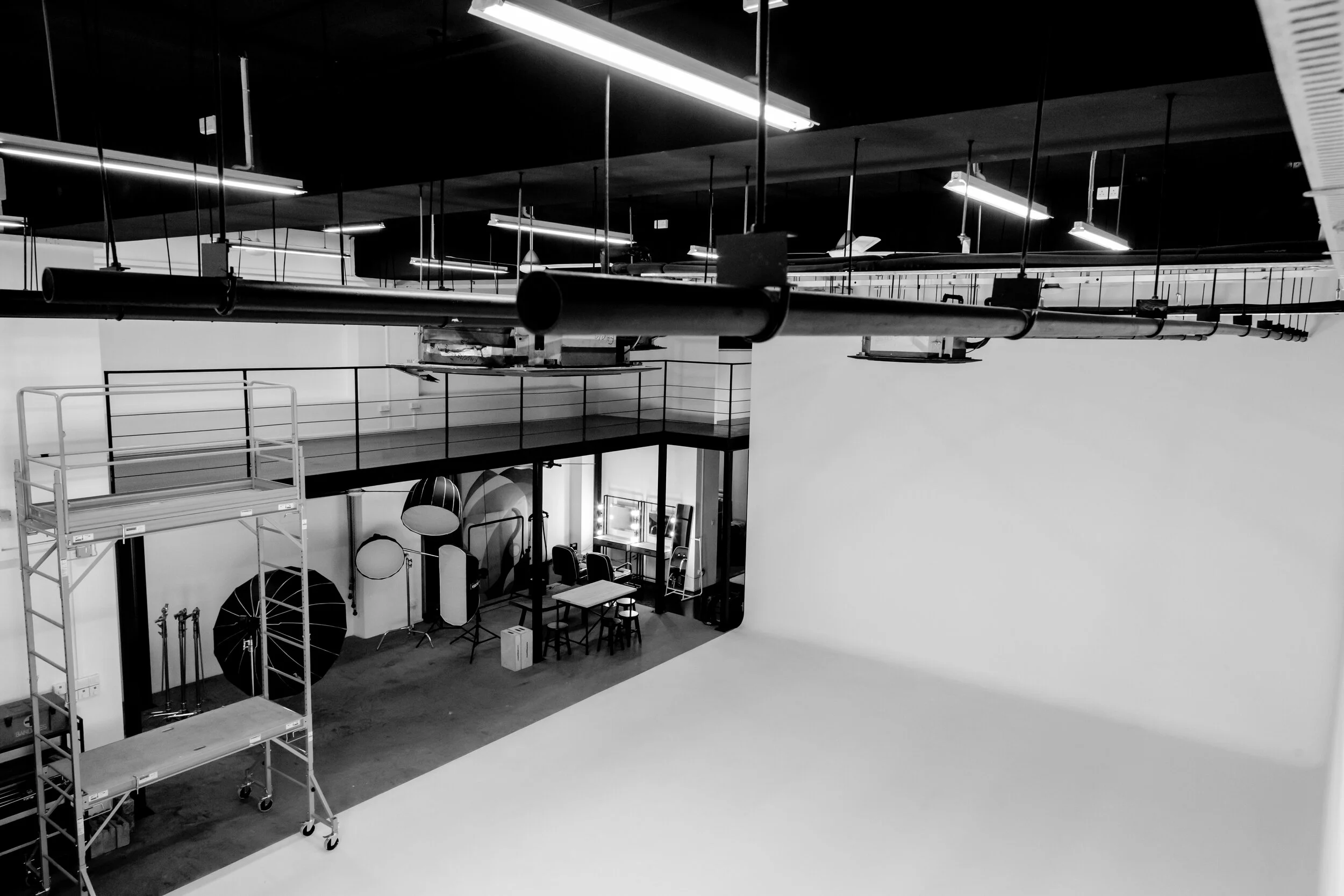 Our whitewashed Cyclorama is built to make your most challenging vision a reality. From avant-garde fashion photography, to filming incredible sci-fi scenes, the possibilities seem almost endless. The mezzanine floor as well as the high ceiling (6 metres) also allows more flexibility for camera angles and lighting fixtures.