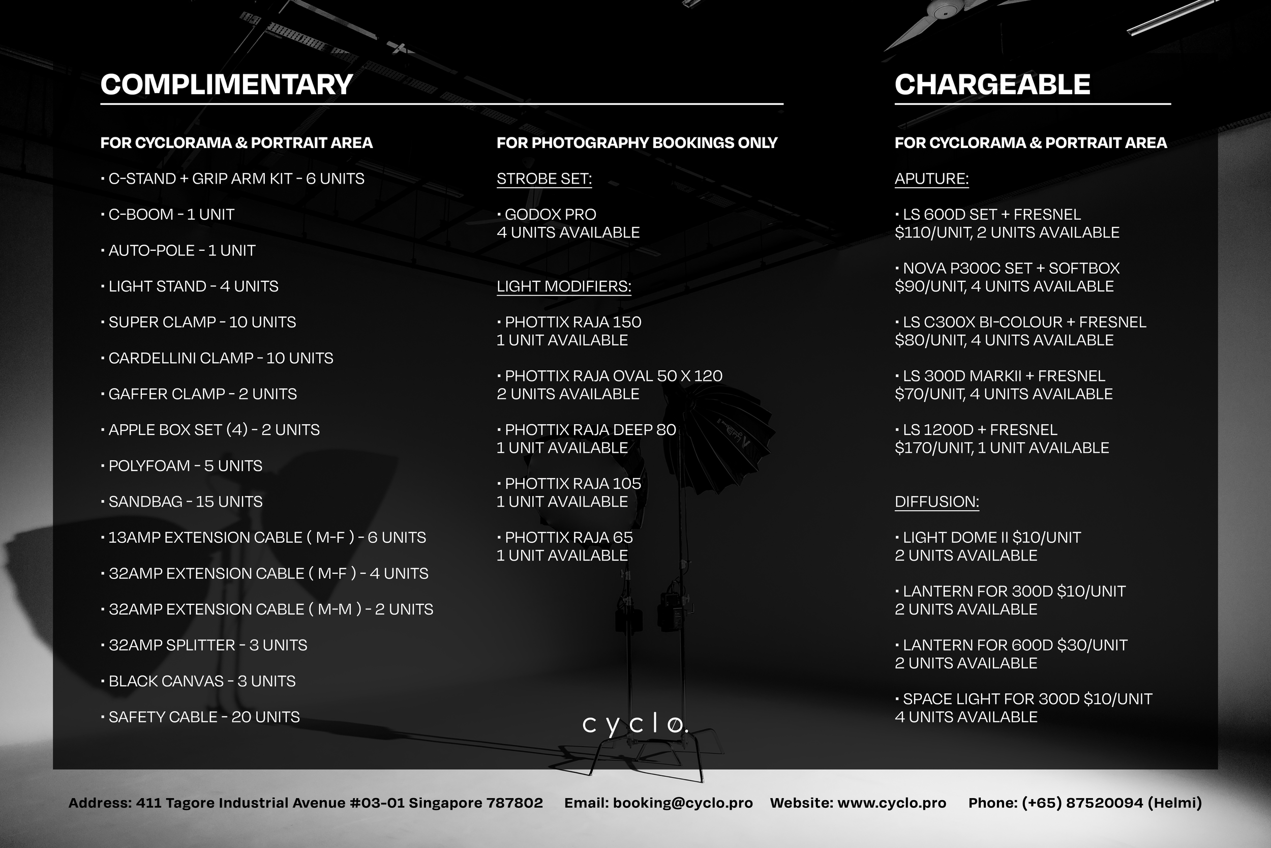 CYCLO is a studio-for-hire that features a Cyclorama and a Portrait Area, built for both photography and videography. It is strategically situated, parking-friendly and close to a number of amenities and eateries. Measuring at approximately 1300 ft², the studio is created to provide a platform for creative minds to push boundaries and explore alternative methods of photo or video production. CYCLO is also catered to live-streaming and multi-cam services. We have recently expanded the space with a fully functional kitchen space that has a movable kitchen island. Do submit an enquiry for more information.